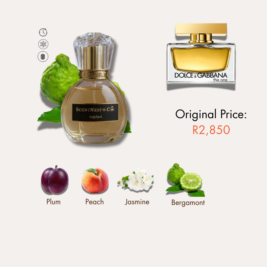 Dolce & Gabbana The One – Inspired Edition A warm oriental floral that feels glamorous and unforgettable. Sparkling bergamot and juicy peach open with radiant brightness, blending into a heart of Madonna lily and jasmine that exudes sophistication. The base of vanilla, amber, and musk lingers with sensual depth, leaving a trail that is both elegant and addictive. Perfect for the woman who commands attention with timeless style and modern allure.